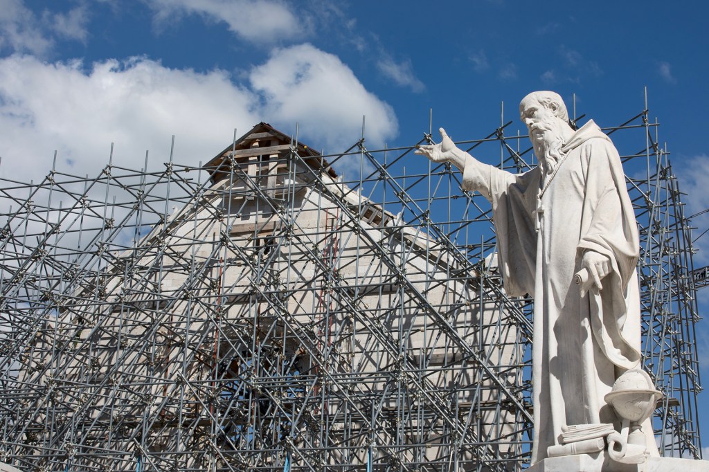 A sinistra, la statua di San Benedetto svetta davanti alla facciata puntellata da una fitta impalcatura dopo il sisma del 2016.