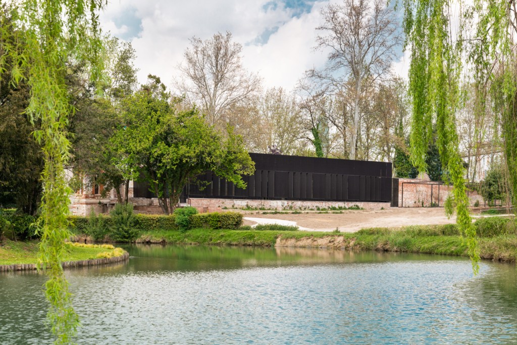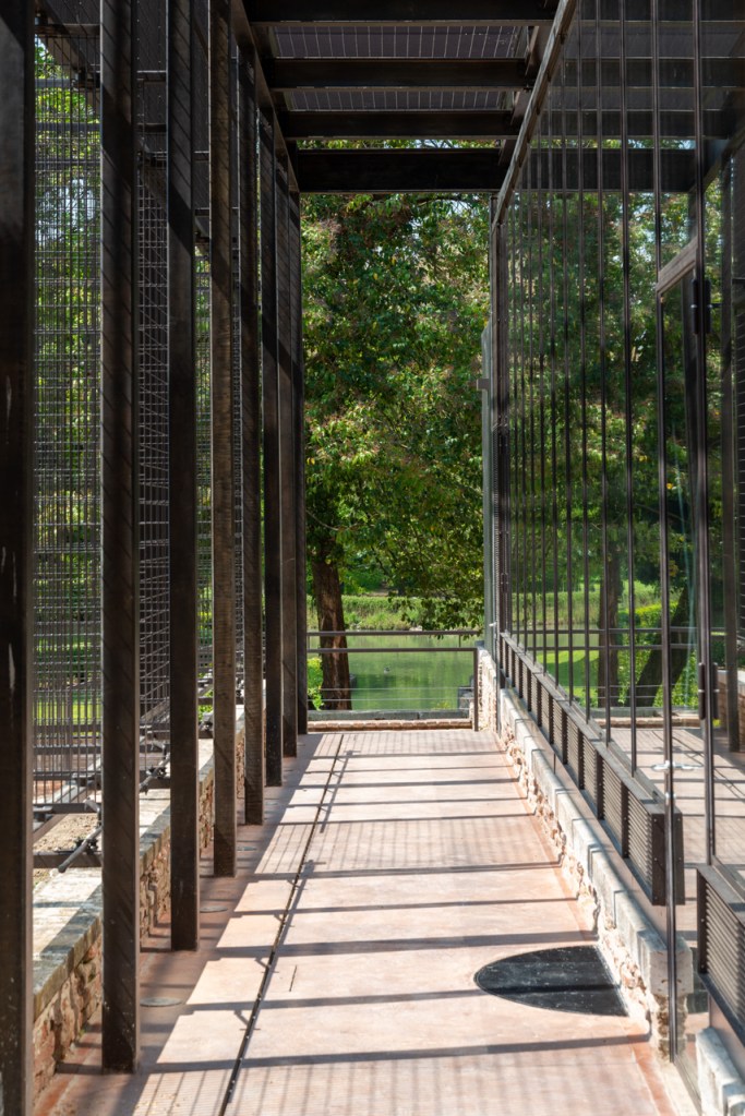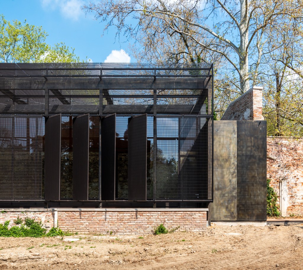 Attraverso l’inserimento di una nuova struttura metallica che ne ricalca le sagome, l’edificio subisce una vera e propria smaterializzazione. Il telaio d’acciaio nudo si trasforma in un diagramma spaziale a grandezza naturale, un’ombra architettonica che evoca la memoria dello volume originario garantendo un effetto di progressiva trasparenza tra interno, esterno e quinta scenica del parco.