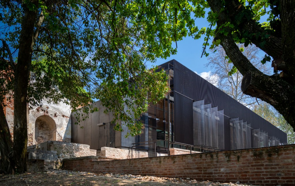 Da un lato, il restauro conservativo puro consolida le murature superstiti e la storica Torretta del Belvedere, cristallizzando i segni del degrado e le ferite storiche sui laterizi antichi. Dall’altro, l’innesto contemporaneo dichiara la sua precisione industriale. Questa dialettica materica instaura un rapporto controllato e onesto per contrasto, dove la tettonica leggera dell’acciaio esalta la matericità frammentata della rovina. La lacuna non viene nascosta, ma trattata come opportunità compositiva.