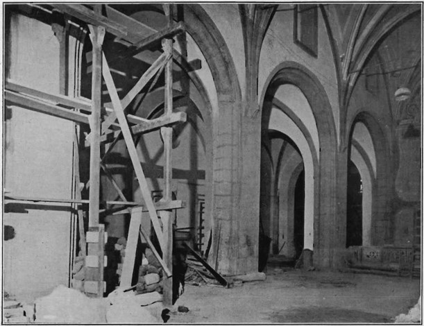 Successivamente, vengono demolite alcune fabbriche addossate all’esterno della chiesa, rivelando le fondazioni del tratto di abside distrutto. Su queste fondazioni, si avvia la ricostruzione delle pareti e dei contrafforti dell’elemento radiale. Ripristinata l’immagine dell’abside trecentesca all’esterno, l’attenzione si sposta all’interno della chiesa. Qui, vengono rifatti i costoloni della volta sulla base delle sagome incise sulla faccia superiore degli abachi dei capitelli. La parte di solaio costruita per prolungare il piano del coro viene demolita, evidenziando gli archi a doppia ghiera che rappresentano la testata del coro trecentesco verso l’abside. Una nuova pavimentazione in coccio pesto viene creata sulla base delle tracce rinvenute in prossimità dei pilastri e delle pareti. Il Chierici si dedica poi alla cappella Loffredo, mettendo in luce gli affreschi che ricoprivano integralmente le pareti interne.